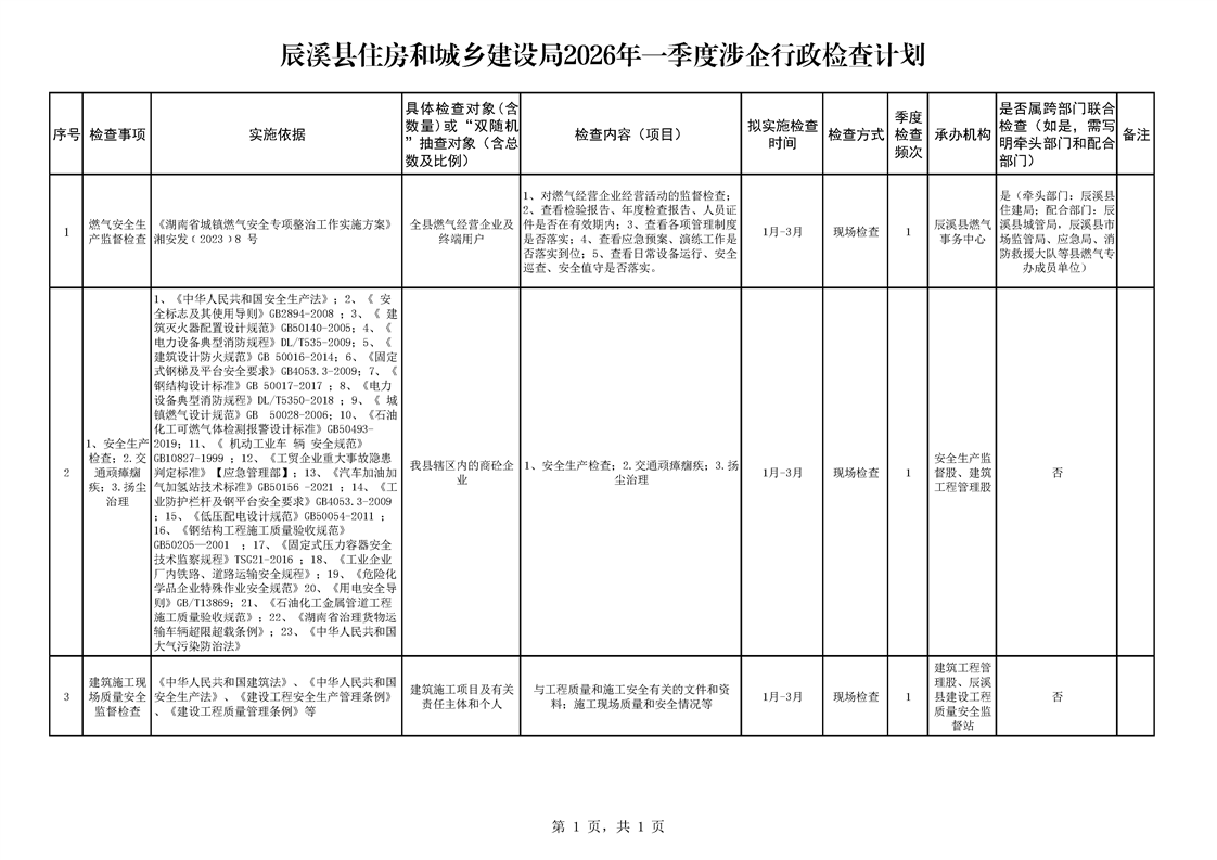辰溪縣住建局2026年第一度涉企行政檢查計劃
