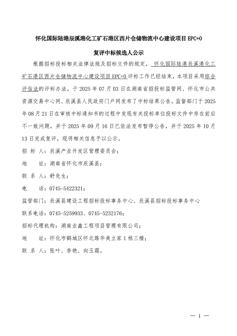 懷化國際陸港辰溪港化工礦石港區西片倉儲物流中心建設項目EPC+0復評中標候選人公示