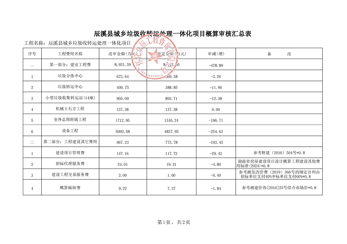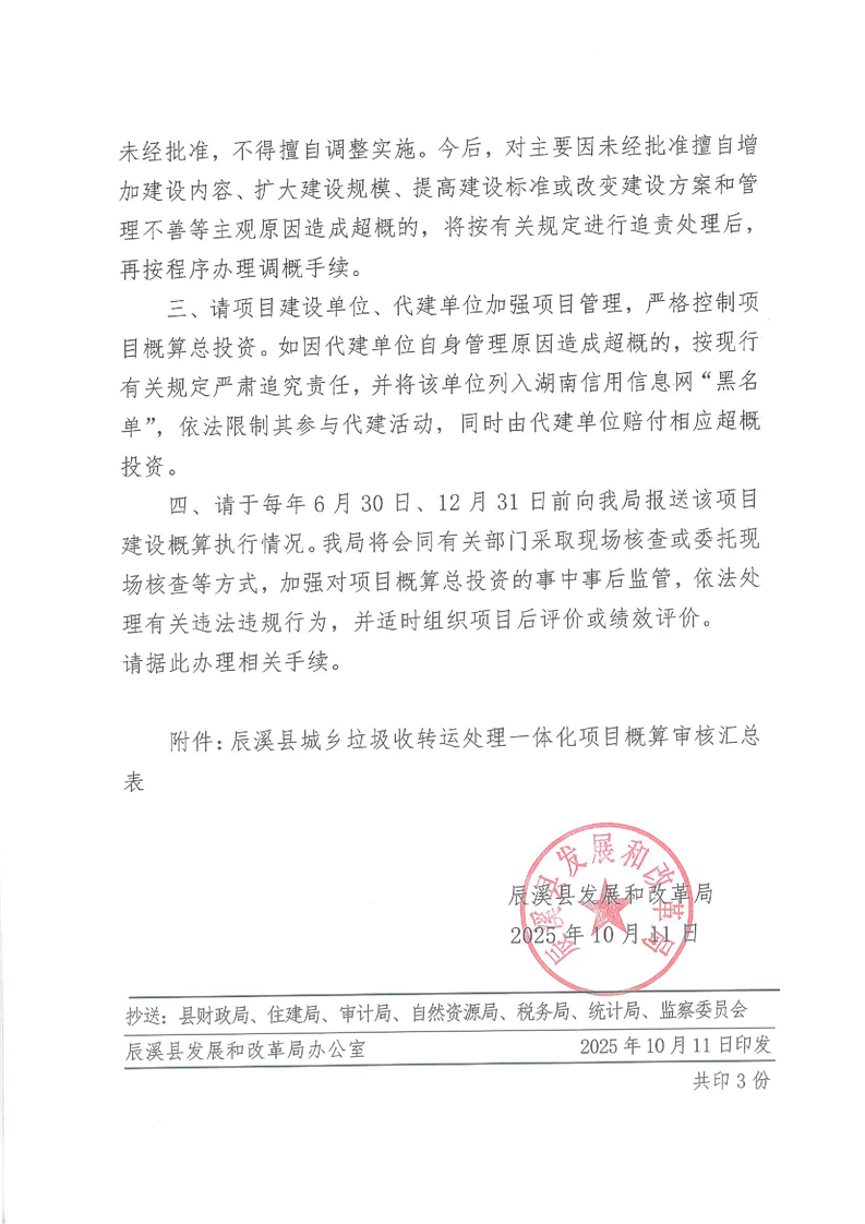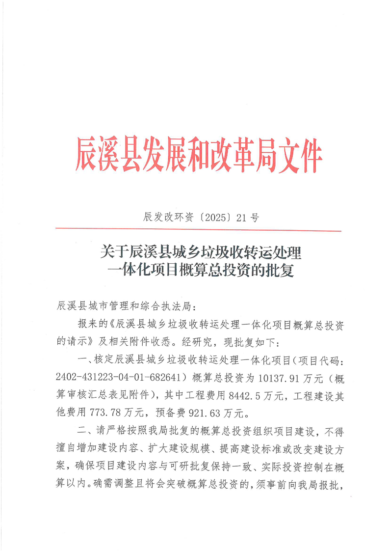 關于辰溪縣城鄉垃圾收轉運處理一體化項目概算總投資的批復