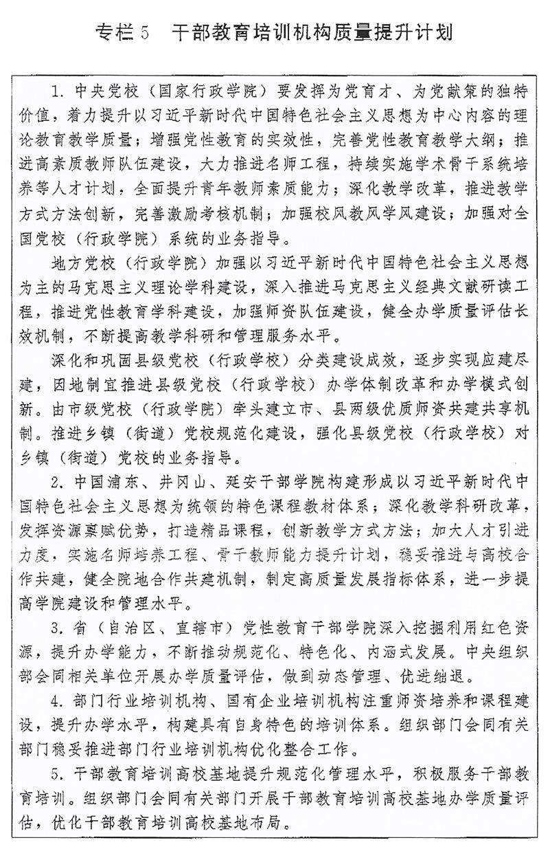 (一)培訓機構建設。推進各級黨校(行政學院)建設,以教學督導、師資培養、質量評估為重點,強化上級黨校(行政學院)對下級黨校(行政學院)的業務指導,不斷提高辦學水平。推進縣級黨校(行政學校)分類建設。加強社會主義學院建設。進一步提升部門行業培訓機構、國有企業培訓機構辦學質量。加強對干部教育培訓高校基地、基層干部教育培訓機構辦學指導。開展黨校(行政學院)、省(自治區、直轄市)黨性教育干部學院、干部教育培訓高校基地辦學質量評估。加強各類黨員干部教育培訓機構規范管理,嚴控新設以黨員干部為培訓對象的培訓機構。支持地方、部門聯合開展培訓,鼓勵干部教育培訓機構開展區域協作交流,推動優質培訓資源共享。實施干部教育培訓機構質量提升計劃(專欄5)。