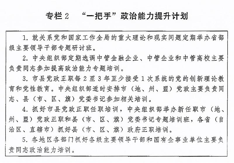(二)突出“關鍵少數”政治訓練。堅持把政治訓練貫穿干部成長全周期,使干部的政治素養、政治能力與擔負的領導職責相匹配。強化“一把手”政治培訓,有計劃地選調地方、部門、國有企事業單位主要負責同志到黨校(行政學院)、干部學院參加專題培訓。實施“一把手”政治能力提升計劃(專欄2)。省(自治區、直轄市)、市(地、州、盟)、縣(市、區、旗)黨政領導班子成員每2至3年到黨校(行政學院)、干部學院至少接受1次系統的黨的創新理論教育和黨性教育,5年內累計不少于2個月。圍繞提高政治能力和領導能力,加強機關司局長、處長任職培訓。重視對女干部、少數民族干部、黨外干部等的政治培訓。加強對高層次人才的政治引領,中央組織部會同有關單位每年組織一定數量人才開展國情研修。