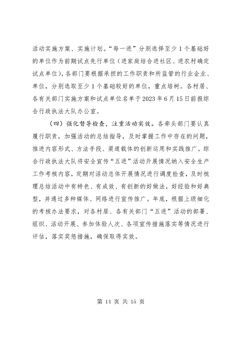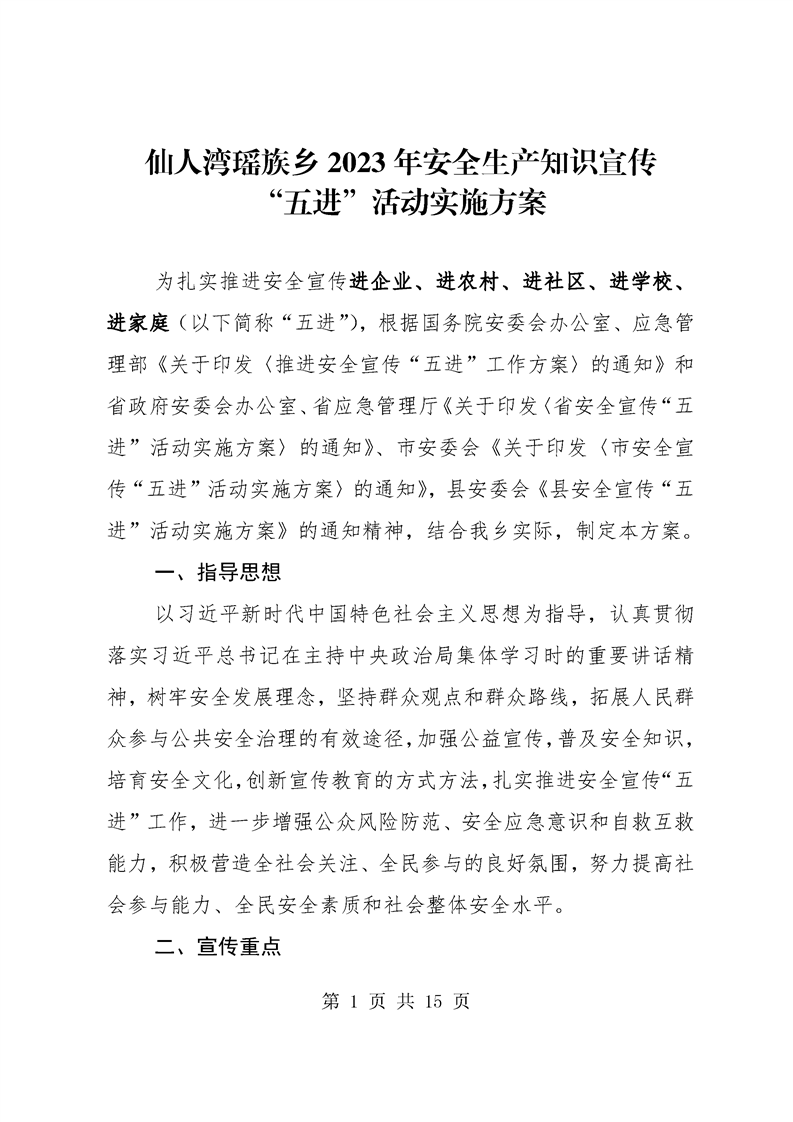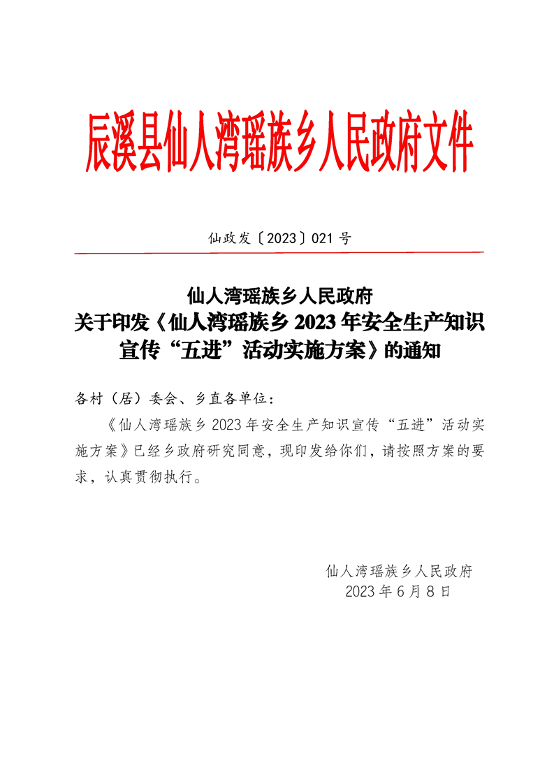 仙人灣瑤族鄉人民政府關于印發《仙人灣瑤族鄉2023年安全生產知識宣傳“五進”活動實施方案》的通知