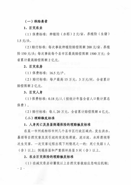 保障范圍:巨災(zāi)農(nóng)房保險的保障范圍涵蓋我省經(jīng)常遭受的暴雨、洪水等自然災(zāi)害及其引起的突發(fā)性滑坡、泥石流、水庫潰壩等次生災(zāi)害造成的農(nóng)村房屋倒塌。巨災(zāi)農(nóng)業(yè)保險的保障范圍涵蓋我省經(jīng)常遭受的暴雨、洪水、干旱等自然災(zāi)害以及重度寒露風(fēng)災(zāi)害或非洲豬瘟等重大動物疫病造成的大宗農(nóng)產(chǎn)品絕收或死亡。
