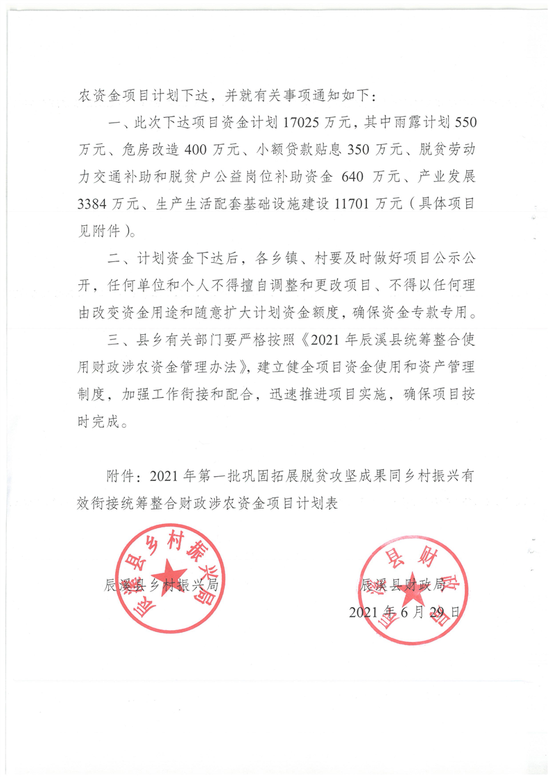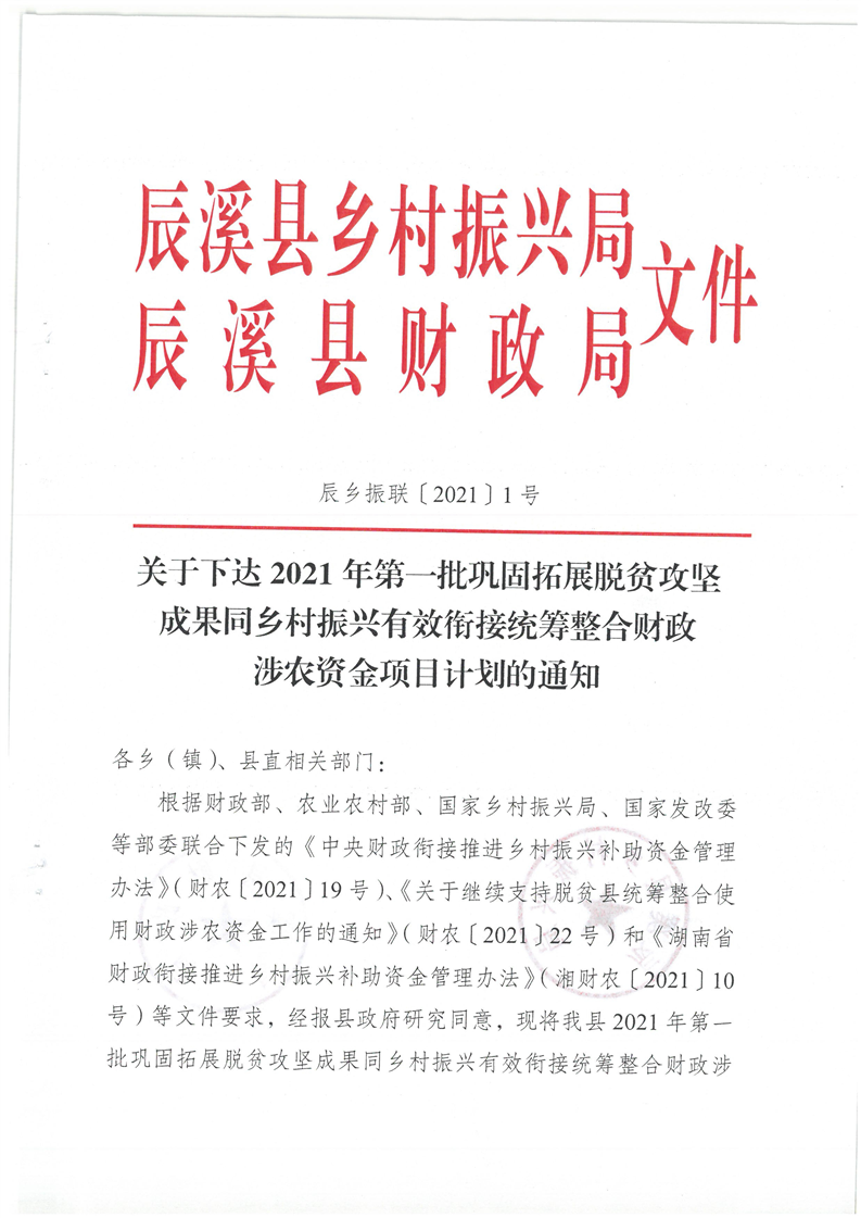 關于下達2021年第一批鞏固拓展脫貧攻堅成果同鄉村振興有效銜接統籌整合財政涉農資金項目計劃的通知