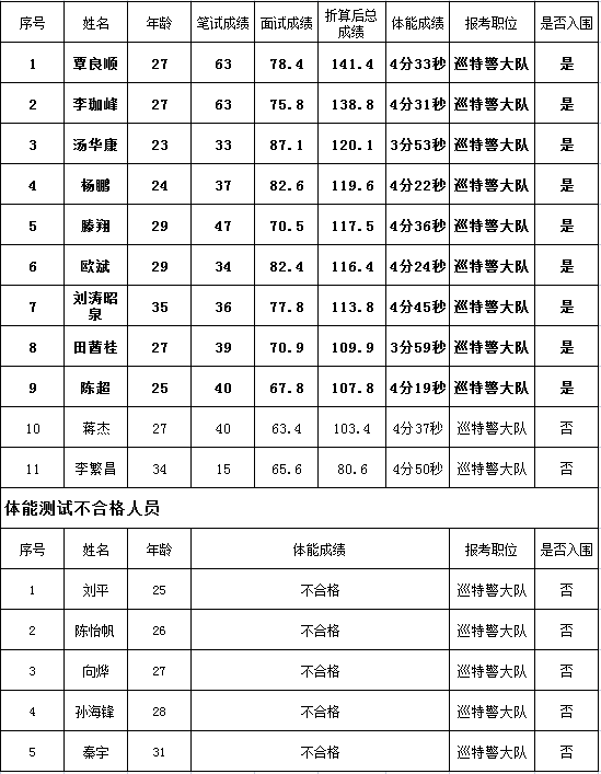 巡特警大隊聘用名單(職位數9人)