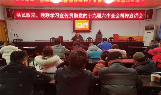 1月6日,縣民政局、殘聯召開學習貫徹黨的十九屆六中全會精神宣講報告會,民政局、殘聯全體黨員(含退休黨員)干部60余人參加學習。