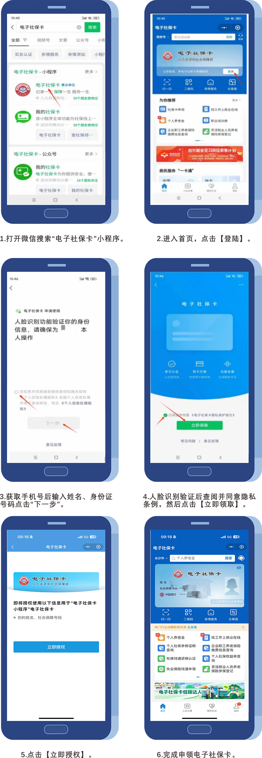 打開微信搜索“電子社??ā毙〕绦?,進入首頁,點擊【登錄】,獲取手機號后輸入姓名、身份證號碼點擊“下一步”,人臉識別驗證后查閱并同意隱私條例,然后點擊【立即領取】,點擊【立即授權】即可完成申領電子社??ā?/p>