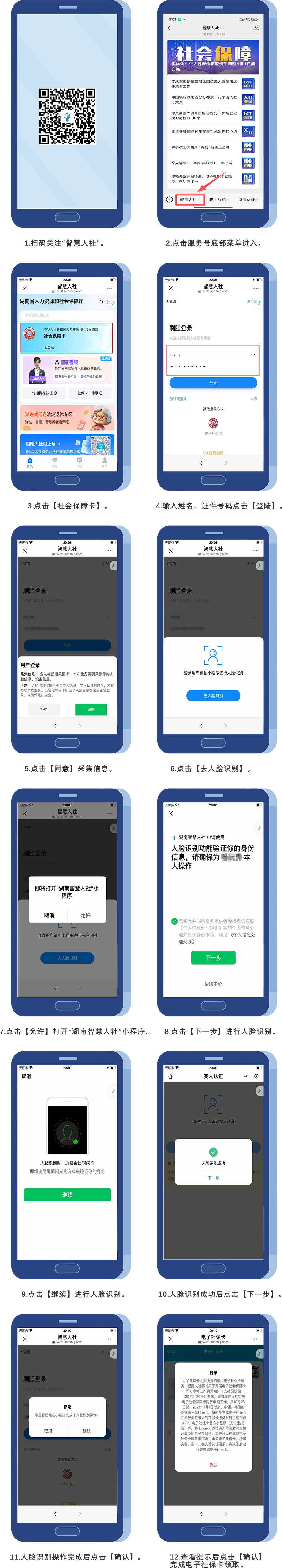 關注“智慧人社”服務號,點擊服務號底部菜單進入,點擊【社會保障卡】,輸入姓名、證件號碼后點擊【登錄】,【同意】采集信息,點擊【去人臉識別】,點擊【允許】打開“湖南智慧人社”小程序,點擊【下一步】進行人臉識別,點擊【繼續】進行人臉識別,人臉識別成功后點擊【下一步】,點擊【確認】,查看提示后點擊【確認】完成電子社保卡領取。
