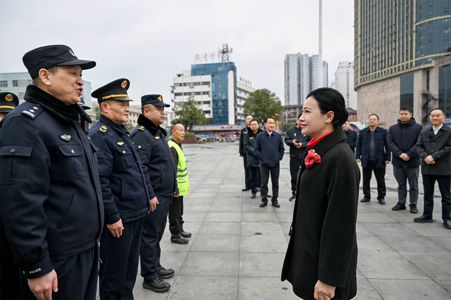 懷化火車站廣場(chǎng)周邊是節(jié)假日主城區(qū)繁忙地段之一。韋朝暉來(lái)到廣場(chǎng)執(zhí)勤點(diǎn),看望慰問(wèn)執(zhí)勤民警、城管執(zhí)法隊(duì)員和環(huán)衛(wèi)工人,感謝他們?cè)诠?jié)日期間堅(jiān)守崗位、默默奉獻(xiàn),叮囑公安部門加強(qiáng)社會(huì)面治安巡邏防控、大型活動(dòng)安全管理、人員密集場(chǎng)所安全防范;城管執(zhí)法部門堅(jiān)持文明執(zhí)法、溫情服務(wù),強(qiáng)化與街道社區(qū)聯(lián)動(dòng)配合,統(tǒng)籌做好市容環(huán)境維護(hù)、煙花爆竹管控等工作;環(huán)衛(wèi)部門切實(shí)關(guān)心關(guān)愛(ài)環(huán)衛(wèi)工人,落實(shí)好各項(xiàng)保障措施,在全社會(huì)營(yíng)造關(guān)心尊重一線勞動(dòng)者的濃厚氛圍。在詳細(xì)了解懷化火車站客運(yùn)流量、運(yùn)力保障等情況后,韋朝暉指出,火車站是展示城市形象的重要窗口,要科學(xué)研判客流變化,細(xì)化服務(wù)保障舉措,確保群眾平安、便捷、溫馨出行。