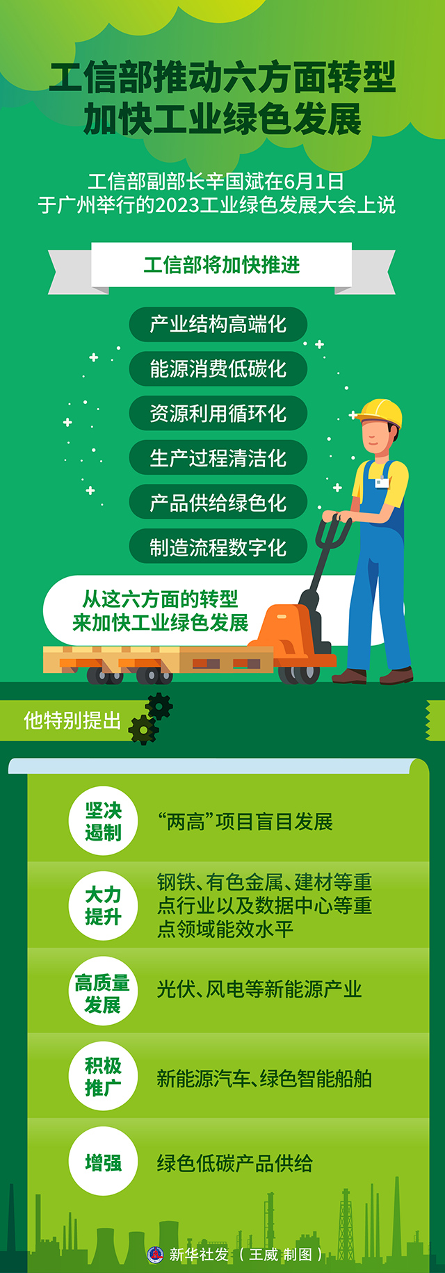 工信部副部長辛國斌在6月1日于廣州舉行的2023工業綠色發展大會上說,要通過加快推進產業結構高端化、能源消費低碳化、資源利用循環化、生產過程清潔化等六方面轉型,全面推進工業綠色發展,將工業綠色發展作為新型工業化的重點,打造綠色新動能。