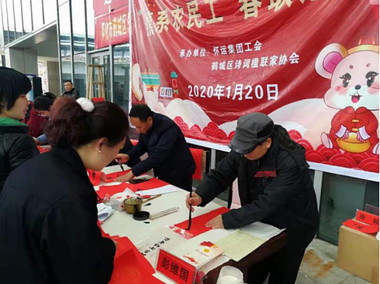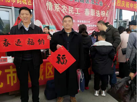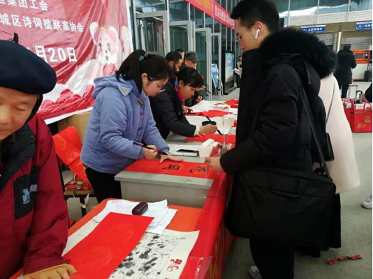 1月20日,懷運集團工會聯合鶴城區詩詞楹聯協會在懷化綜合客運樞紐站開展“情系農民工,春聯送祝?!被顒印?/p>