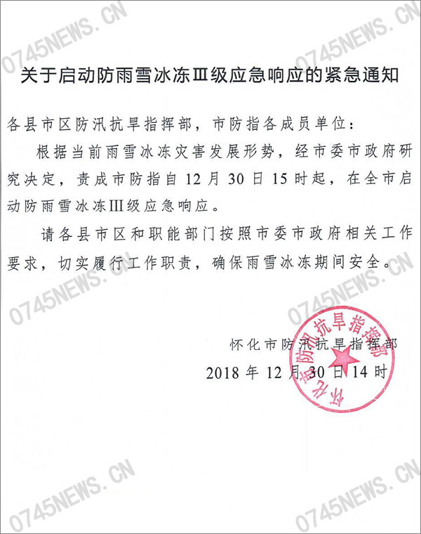 懷化市啟動(dòng)防雨雪冰凍Ⅲ級應(yīng)急響應(yīng)