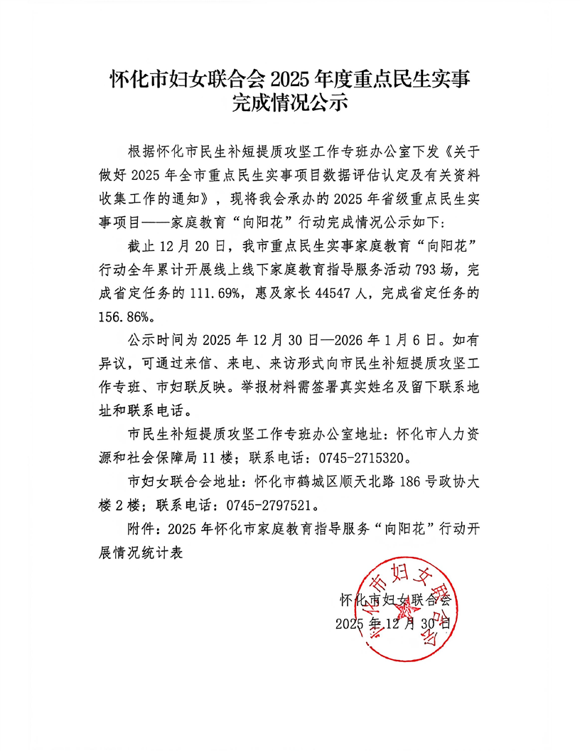 懷化市婦女聯合會2025年度重點民生實事完成情況公示