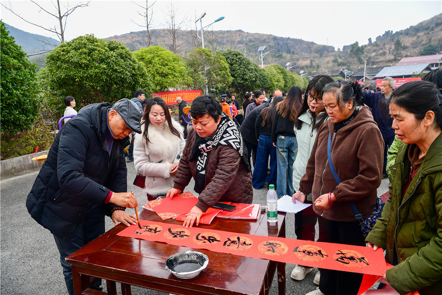 1月18日上午,“翰墨飄香迎新春 春聯福字送萬家”寫春聯送祝?;顒釉邡Q城區黃巖旅游度假區舉行。書法家揮毫潑墨,游客即興創作,紅聯映云海,福字暖人心,山間年味滿溢。(懷化日報全媒體記者 潘雨 攝)