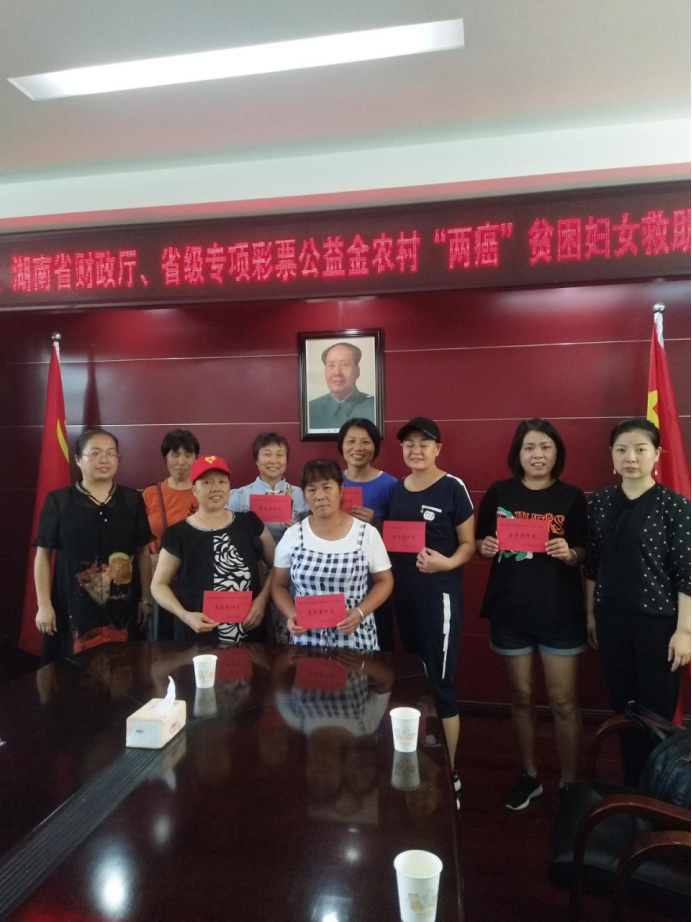 2019年上半年,懷化市共爭取到省級專項彩票公益金、農村“兩癌”貧困婦女救助金32.4萬元,救助全市27名兩癌貧困患者,旨在幫助不幸患病的貧困婦女們能充分發揚“自尊、自信、自立、自強”精神,積極樂觀面對生活,堅強勇敢對抗病魔,把黨和政府的關愛化作戰勝疾病的力量,用頑強的意志創造美好燦爛的明天。(圖為8月28日,洪江市“兩癌”貧困婦女救助金發放現場)