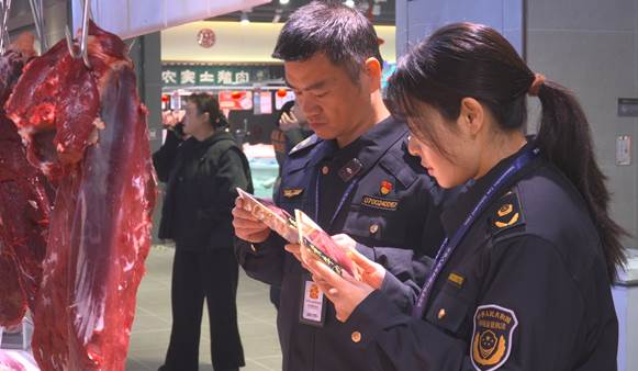 在主城區大型超市,執法人員聚焦春節消費熱門品類,選取不同品牌預包裝食品,仔細查看生產日期、有效期、執行標準、配料表等信息,嚴防“三無”食品、過期食品流入市場;同時,依托農產品質量安全可追溯系統,掃碼查驗牛肉、豬肉等畜禽肉承諾達標合格證、檢疫檢驗證等情況。檢查過程中,執法人員現場督促超市經營者嚴格落實食品安全主體責任,嚴把進貨查驗關,定期自查并及時清理臨期、不合格食品,切實從源頭防范食品安全風險。