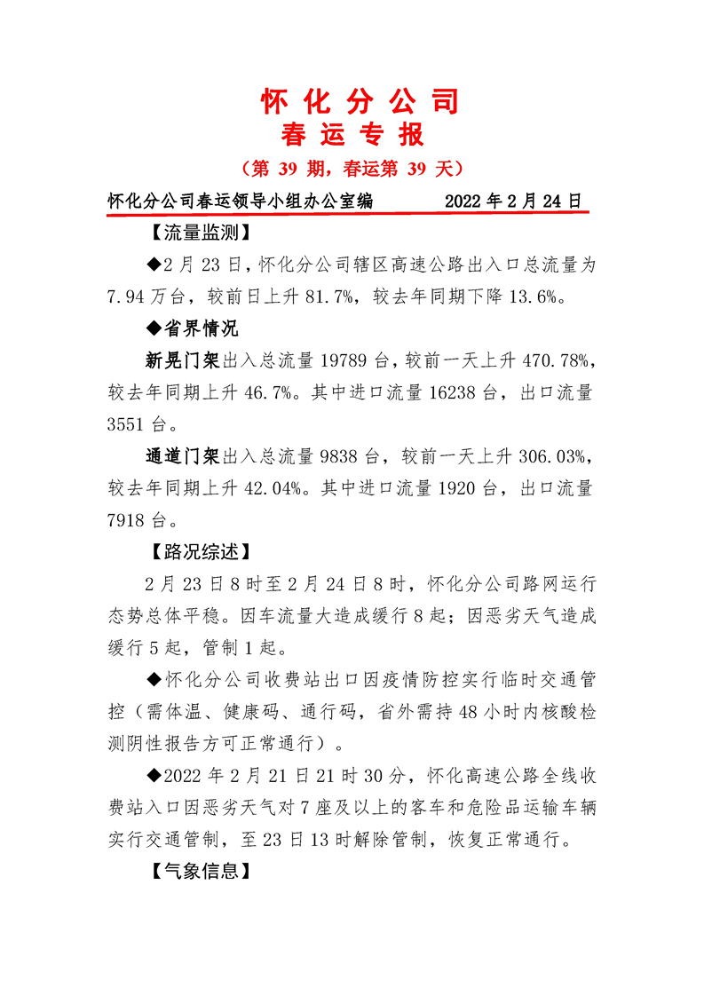 2022年高速懷化分公司第39期春運專報