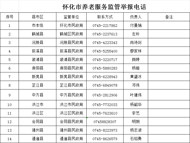為響應社會為老服務需求,提升養老服務質量,加強對養老機構和養老從業人員的監督,回應民眾關切,推動養老事業和養老產業協同健康發展,經市縣民政部門確認,現將懷化市縣兩級養老服務熱線和監管舉報電話,在懷化轄區內依法辦理法人登記并在民政部門備案且通過消防審驗的養老機構名單予以公布并接受社會各界的監督。