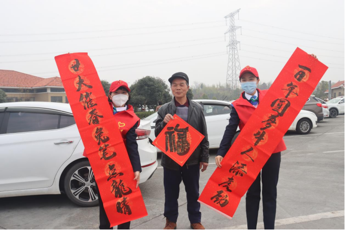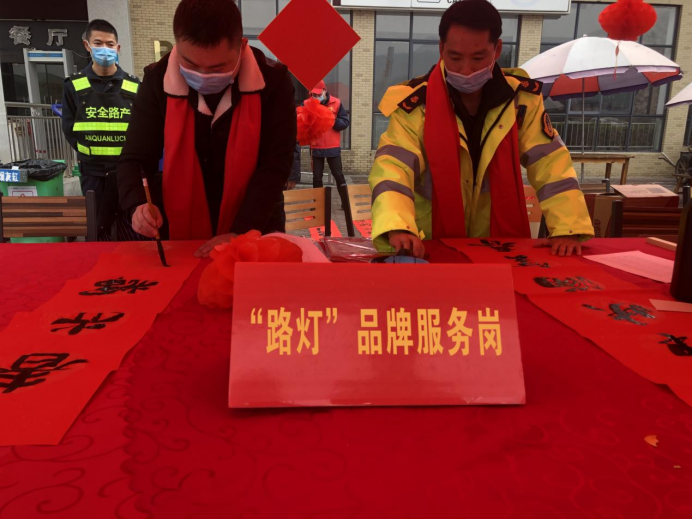 冬日暖陽,春節腳步臨近。1月11日,在G65包茂高速公路洪江服務區內,繁忙而有序。在服務區一側,懷化分公司的“路燈”志愿者正在現場揮毫潑墨、寫福送春聯,洋溢著濃濃的喜慶氛圍。活動現場引來許多司乘朋友圍觀,有的直接挑選已經寫好的“成品”,有的則根據自己的需要邀請志愿者為他們“量身定制”。一幅幅紅春聯和金燦燦的“福”字滿載著新春祝福,傳遞著濃濃溫情。