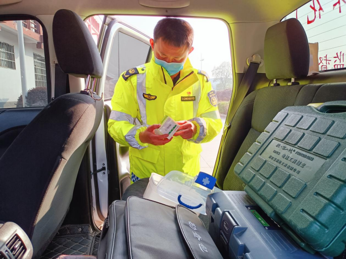 (檢查巡邏車上藥品、工具。)