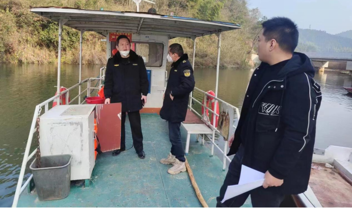 1月9日,靖州縣交通運輸綜合行政執法大隊執法人員對一鄉鎮渡口的渡船進行檢查