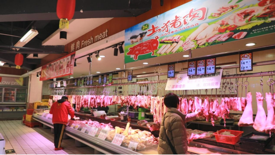 超市里,生鮮攤位前的市民們有序挑選著當天的豬肉產品,查看肥瘦,詢問部位和價格。工作人員則根據顧客需求切割、稱重。一片安心、祥和的民生圖景。